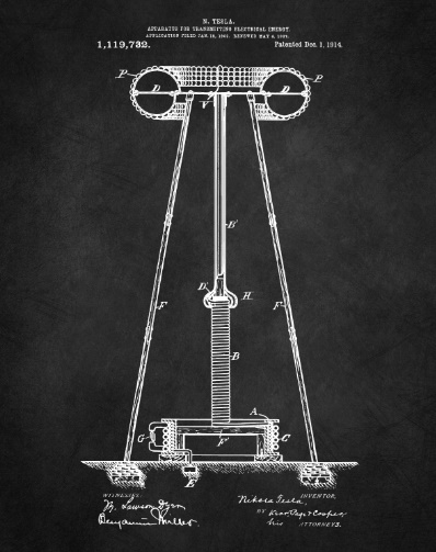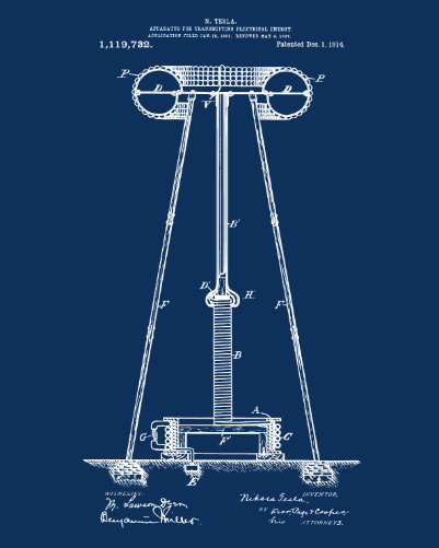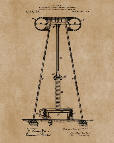 This patent print features the Tesla Transmission Tower patented in 1914 by Nikola Tesla.