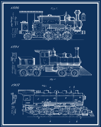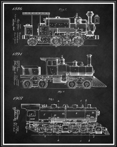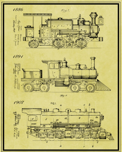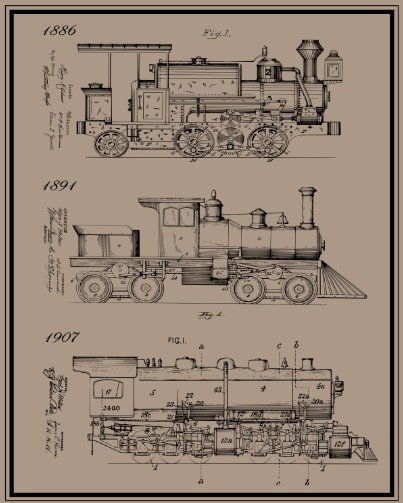 This patent print features 3 Vintage Steam Trains Patented from 1886 – 1907.
